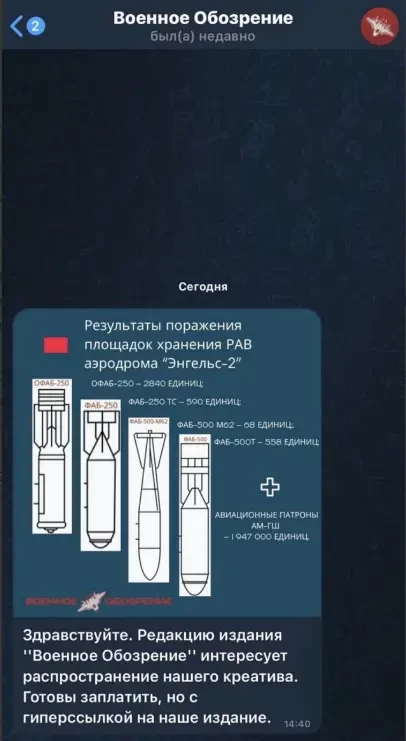 Суть попытки состояла в следующем: украинские ЦИПсО, представляясь сотрудниками ТГ-канала «Военного обозрения», предлагали за плату разместить в ТГ «креатив», представляющий собой фейковые новости. При этом для реализации своего замысла – с целью прикрыться «Военным обозрением» - делали запрос на возможность публикацию гиперссылки на наш реальный канал в других ТГ-каналах - как якобы на первоисточник.