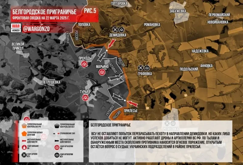Российские части зачищают приграничные лесополосы, там идут стрелковые бои, работает артиллерия и дроны. К сегодняшнему утру к югу от Демидовки в лесополосах и в балках у Графовки остаются несколько групп ВСУ.