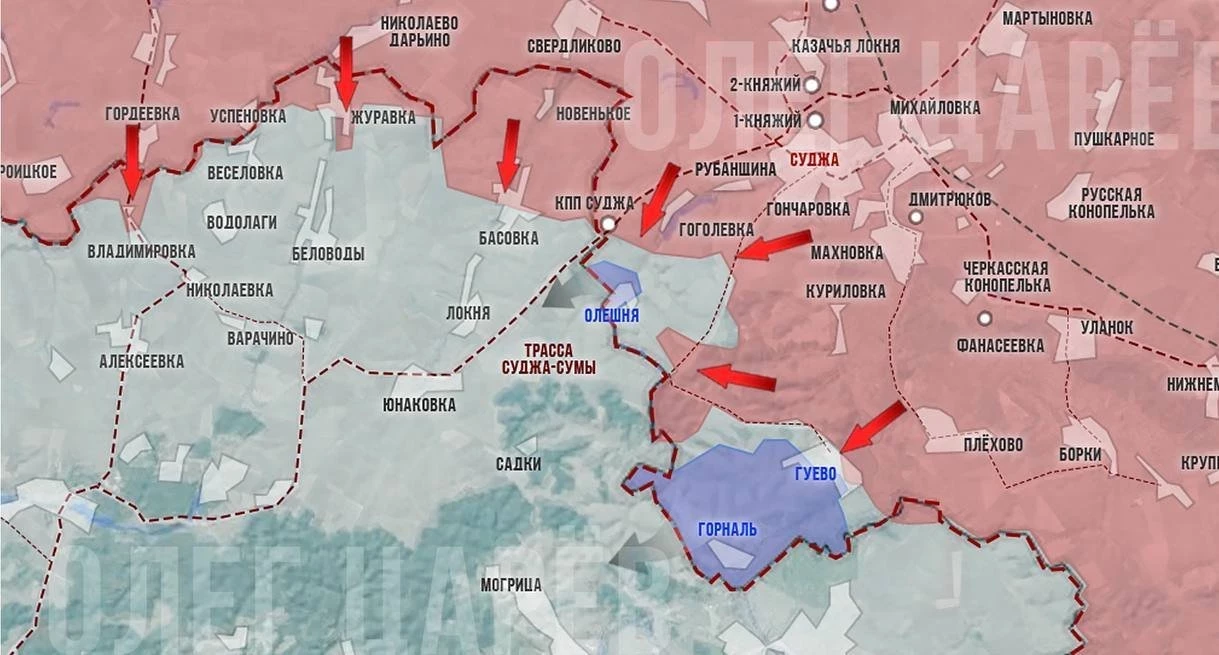 Военнослужащие Вооружённых сил Российской Федерации (ВС РФ) на протяжении последних нескольких дней ведут штурмовые действия в районе населённых пунктов Олешня и Гуево в Курской области.