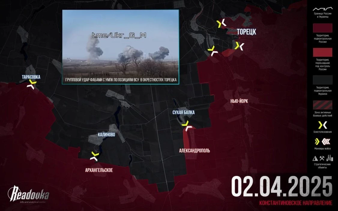 В районе Торецка ВС РФ закрепились на окраинах Валентиновки и выходят к крайним домам Сухой Балки. По этому посёлку проходит основная линия обороны ВСУ, ее преодоление позволит ВС РФ развернуть дальнейшее продвижение западнее Торецка на север. В самом Торецке наша армия зачищает позиции, которые ВСУ успели создать за время февральских контратак, сообщает Олег Царёв в своём Telegram-канале.