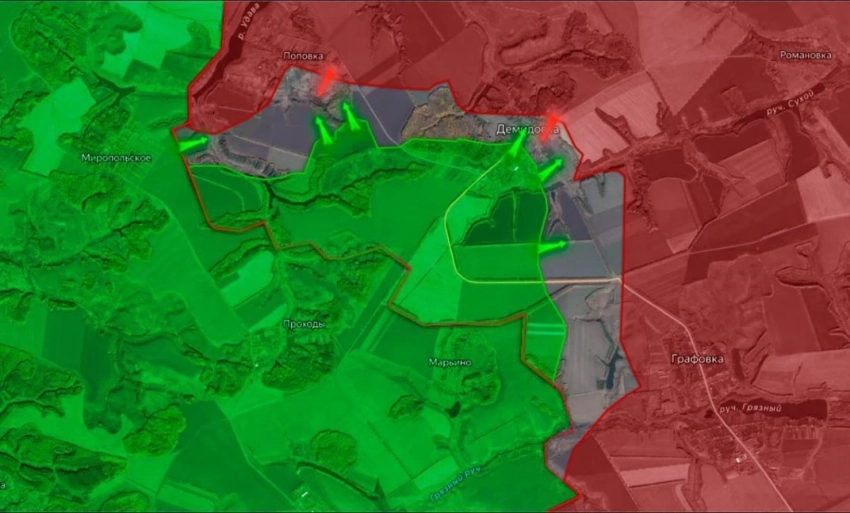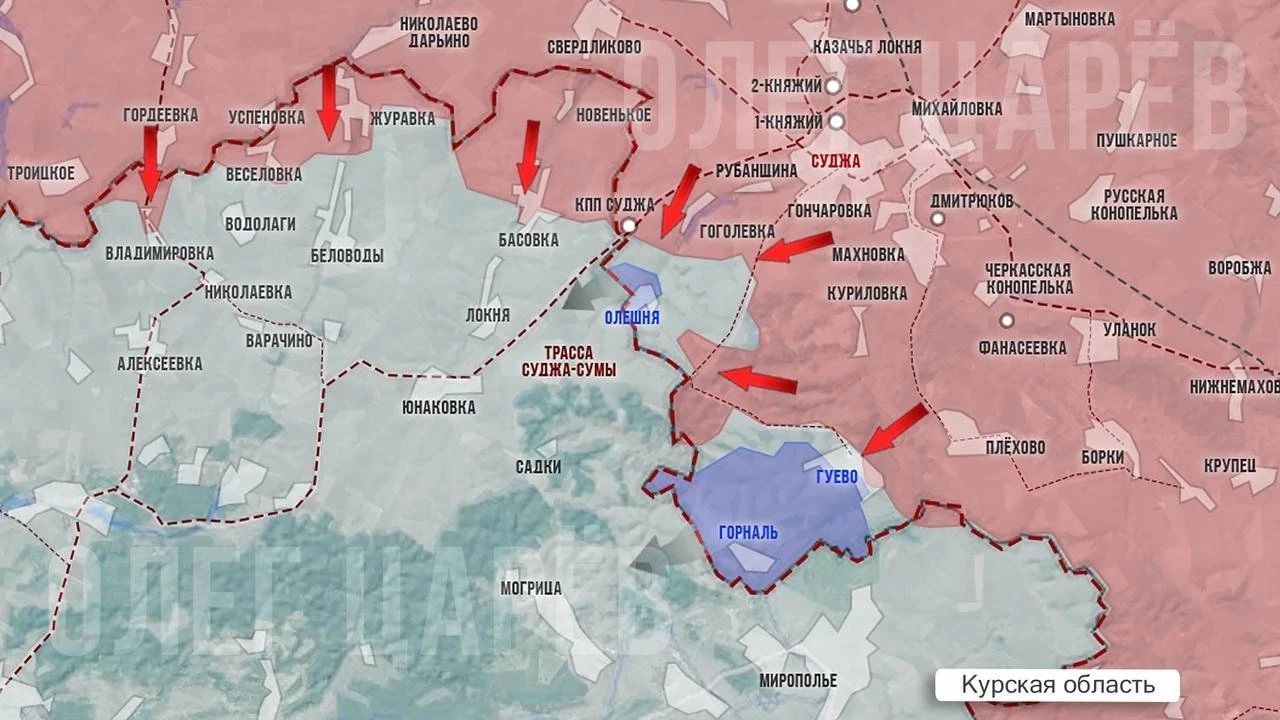 В Гуево накануне шло сражение за южные окраины, большая часть села и все ключевые точки уже под контролем наших сил. Также наши наступают на высоты перед хутором Горналь. Сообщают, что ВСУ отступают к Свято-Никольскому монастырю.