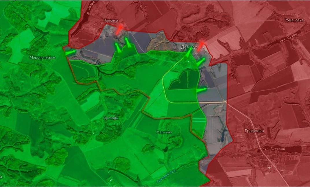 Telegram-канал "Северный ветер" сообщил о том, что на Сумском направлении Бесстрашные продолжают зачистку Гуево и окрестностей населенного пункта, а также ведут бои на подступах к хутору Олешня.