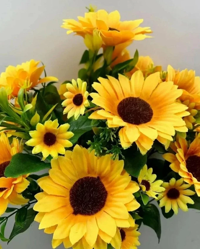 Искусственные цветы – это универсальное решение для создания уютного интерьера и стильных композиций. Букет подсолнухов из 13 веток – яркое и эффектное украшение, которое придаст пространству солнечное настроение. Благодаря качественному исполнению, цветы выглядят естественно, а их пышные бутоны делают композицию живой и выразительной. Этот букет можно использовать для оформления дома, офиса или праздничных мероприятий. Высота букета составляет 50 см, что позволяет размещать его в напольных и настольных вазах. Чтобы добиться максимальной пышности, рекомендуется слегка отпарить бутоны после транспортировки. Искусственные подсолнухи не требуют ухода, не вянут и долго сохраняют привлекательный вид.