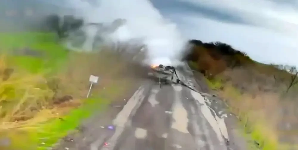 Похоже, танк двигался по тыловой части дороги, однако наехал на противотанковую мину, выходит, установленную украинскими саперами. По обездвиженной бронемашине сразу отработал высокоточный барражирующий боеприпас «Ланцет». Ну и чтобы уж совсем не оставить противнику шансы на эвакуацию и возможное восстановление машины, танк добили наши FPV-дроны.