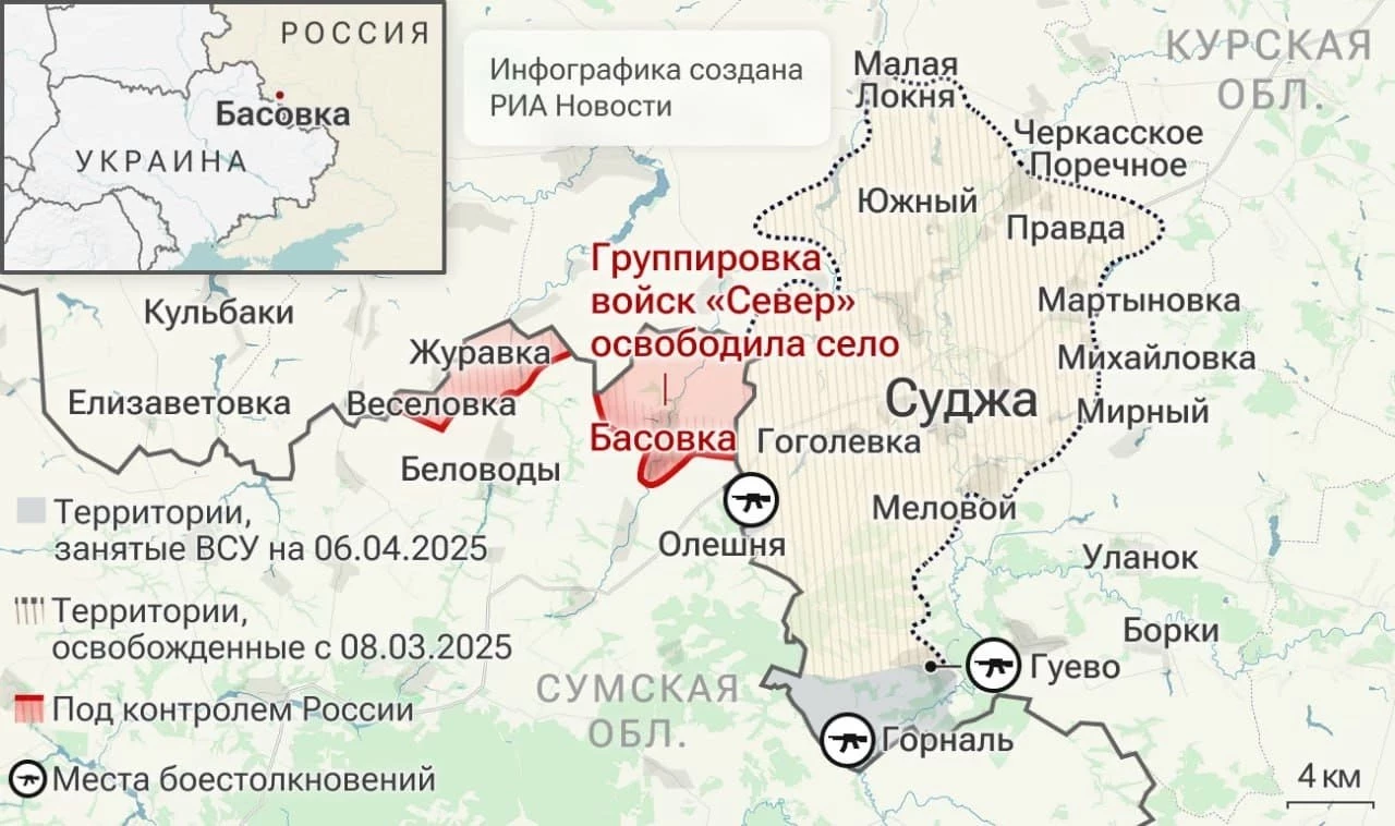 Сообщают о больших потерях противника в селе Водолаги у Владимировки, где в результате атаки наших беспилотников были уничтожены две группы резервов противника и бронетехника. Сегодня Минобороны официально сообщило о взятии под контроль Басовки Сумской области. Также сообщают о зачистке участка между Басовкой и ГИС «Суджа» на глубину 2 км.