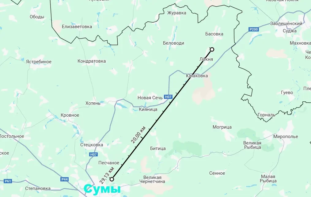 По состоянию на текущий момент передовые подразделения ВС РФ находятся на расстоянии примерно 40 км от Сум по автомобильным дорогам и около 29 км – по прямой. При этом продвижение продолжается.