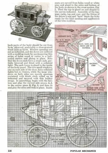 У каждой нации всегда был свой исторически сложившийся и потому любимый тип транспорта. В Англии и США таким транспортом стал дилижанс. Ну и, разумеется, его модель была предложена журналом «Популярная механика» для изготовления ещё в 1946 году. «Дилижанс» – культовый фильм 1939 года, «Гордость и предубеждение» (1995), ну и, разумеется, «Наш человек с бульвара Капуцинов» (1987), ну никак не могли обойтись без этого вида транспорта. В январском номере «Популярной механики» было опубликовано сразу несколько статей о том, как сделать его модель.