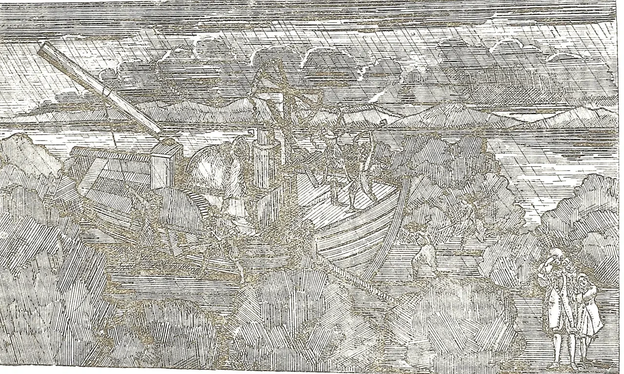 Гравюра неизвестного художника, иллюстрирующая уничтожение парохода Папина (отчаявшийся изобретатель запечатлен в нижнем правом углу)