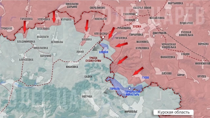 В приграничье Курской области бойцы Вооружённых сил Российской Федерации (ВС РФ) ведут сражение за Олешню и Горналь. ВСУ не сдаются, перебрасывают подкрепления к Олешне, по данным с мест, наши военные уничтожили несколько штурмовых групп спецназа ВСУ.