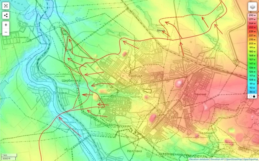 В сообщении также указывается, что российские войска продолжают попытки продвижения вдоль балки из района Преображенки, что сильно затрудняет задачу обороны для украинских сил. Кроме того, ВС России закрепились в серой зоне недалеко от Надеевки.