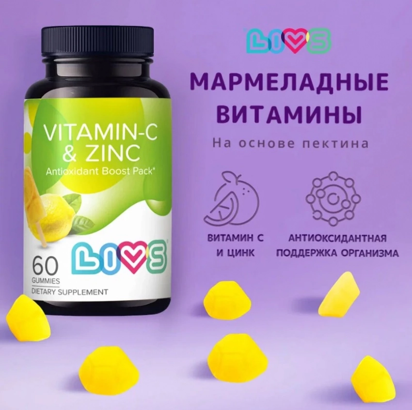 LIVS Витаминный комплекс с витамином C и цинком — это удобная и эффективная добавка в виде жевательных пастилок со вкусом лимонного мороженого. В составе — 125 мг витамина C и 25 мг цинка, которые способствуют поддержке иммунной системы, улучшению состояния кожи, предотвращению выпадения волос и нормализации работы сальных желез. Комплекс из натуральных ингредиентов (пектин, экстракт куркумы) не содержит аллергенов и консервантов, что делает его безопасным и приятным для ежедневного употребления. Продукт идеален для взрослых, ищущих способ повысить иммунитет и общее самочувствие.