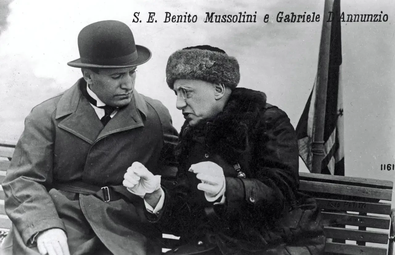 Единственный минус — Муссолини видел в д'Аннунцио реального конкурента, а потому в политику категорически не пустил. На всякий случай. Но в гости заезжал, руку жал, учителем называл. Перекопировал кучу того, что придумал д'Аннунцио для своих легионеров.