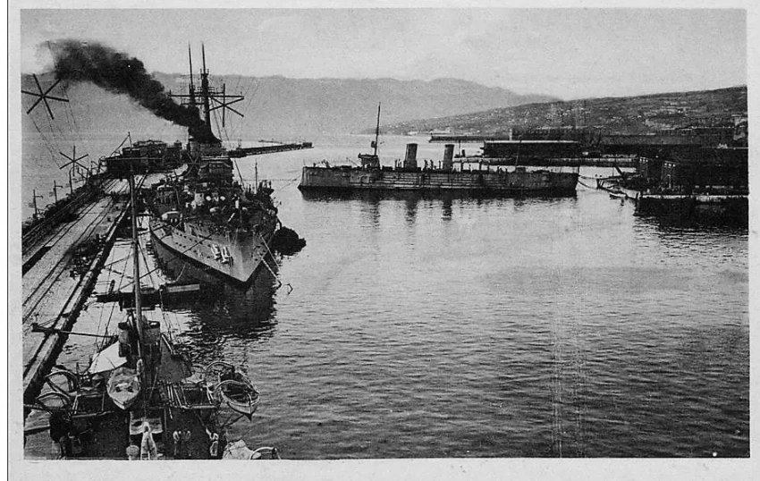 Крейсер "Кортелазо" контролирует гавань Фиуме, линкор "Андреа Дориа" слева
