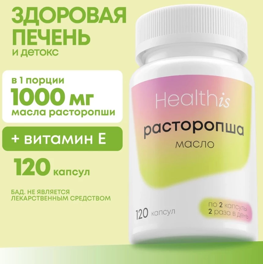 В топе БАДов для печени масло расторопши от Health Is уверенно держит позицию благодаря высокой концентрации активного вещества — 1000 мг на суточный приём. Добавка создана на основе натурального масла из семян расторопши с добавлением линолевой кислоты и витамина Е, которые усиливают антиоксидантное и противовоспалительное действие. Поддерживает печень при повышенных нагрузках, способствует мягкому пищеварению и помогает при синдроме раздражённого кишечника. Формат капсул обеспечивает удобство приёма и высокую усвояемость.