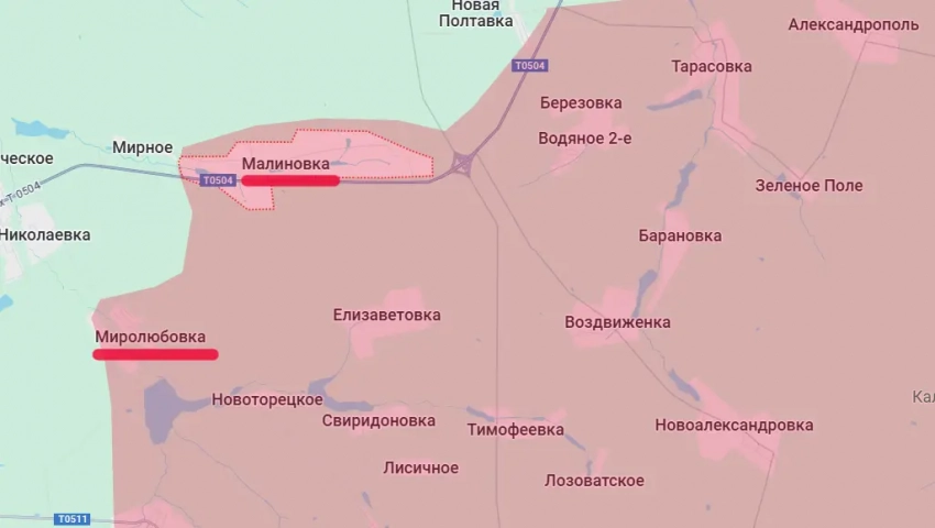 Малиновка располагается на Покровском направлении. Её освобождение стало следующим после взятия нашими бойцами под контроль села Миролюбовка, что юго-западнее Малиновки. Таким образом ВС РФ значительно расширили контроль над участком автодороги Покровск (Красноармейск) – Константиновка. И на данный момент физически контролируемый бойцами армии России участок этой дороги (Т0504) протянулся от западных окраин Малиновки до района села Новая Полтавка, а это не менее 7 км. Примерно столько же от Малиновки до Мирнограда.