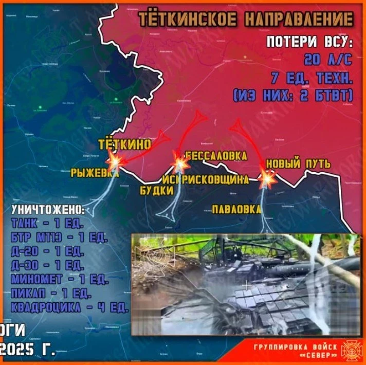 Непосредственно в окрестностях Тёткино остались разрозненные группы оккупантов. Северяне продолжают зачистку приграничных территорий, фиксируя значительное количество тел противников, умерших от потери крови.