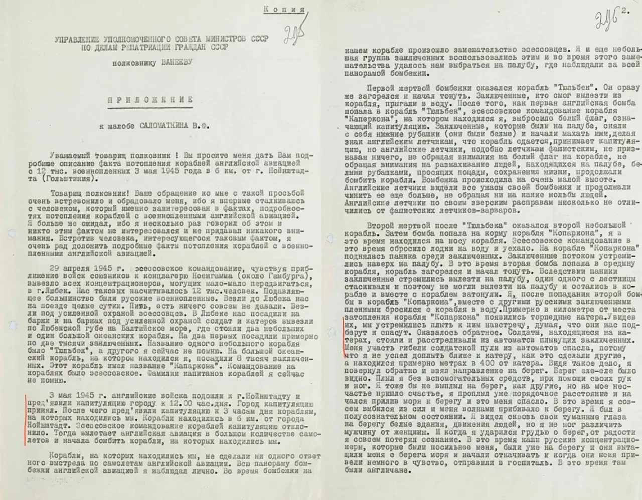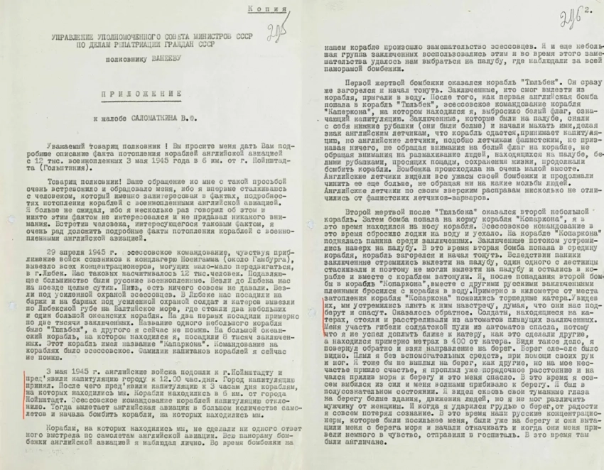 «Первой жертвой бомбёжки оказался корабль «Тюльбек», эсэсовское командование корабля «Кап Аркона», на котором находился я, выбросило белый флаг, означающий капитуляцию. Заключённые, которые были на палубе, сняли с себя нижние рубашки (они были белые) и начали махать ими, делая знак английским лётчикам, что корабль сдаётся, принимает капитуляцию, но английские лётчики, подобно лётчикам фашистским, не признавая ничего, не обращая внимания на белый флаг на корабле, не обращая внимания на размахивание людей, находящихся на палубе, белыми рубашками, просящих пощады, сохранения жизни, продолжали бомбить корабли. Бомбёжка происходила на очень малой высоте. Английские лётчики видели все ужасы своей бомбёжки и продолжали чинить её ещё больше, не обращая внимания ни на какие мольбы людей. Английские лётчики по своим зверским расправам нисколько не отличаются от фашистских лётчиков-варваров».
