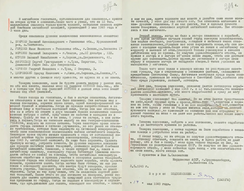 Новые подробности этой трагедии оказались известны благодаря обнаруженному в архивах письму одного из узников концлагерей, которое находилось в материалах переписки МГБ СССР с управлением уполномоченного Совета министров СССР по делам репатриации советских граждан за 1949 год. Письмо написано от имени непосредственного участника трагедии 3 мая 1945 года Василия Саломаткина (1919–1999).