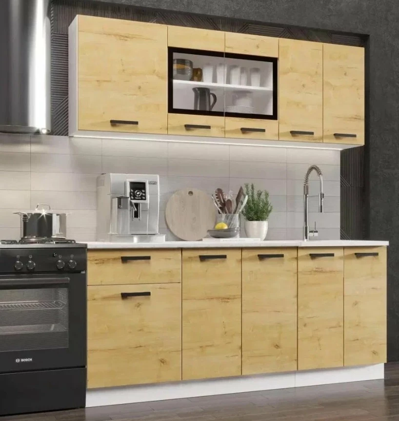 Кухонный гарнитур от Hoff в цвете дуб золотой — это практичный и эстетичный вариант для тех, кто ищет продуманное решение в среднем ценовом сегменте. В рейтинг мебели для кухни этот комплект заслуженно попадает благодаря сбалансированному сочетанию функциональности и визуальной выразительности. Он включает четыре ключевых модуля и столешницу, что позволяет быстро обустроить компактную кухню без лишней суеты. Высокие навесные шкафы обеспечивают максимум полезного пространства, а нижние столы удобны в повседневной эксплуатации. Отличный выбор для квартир с ограниченной площадью.