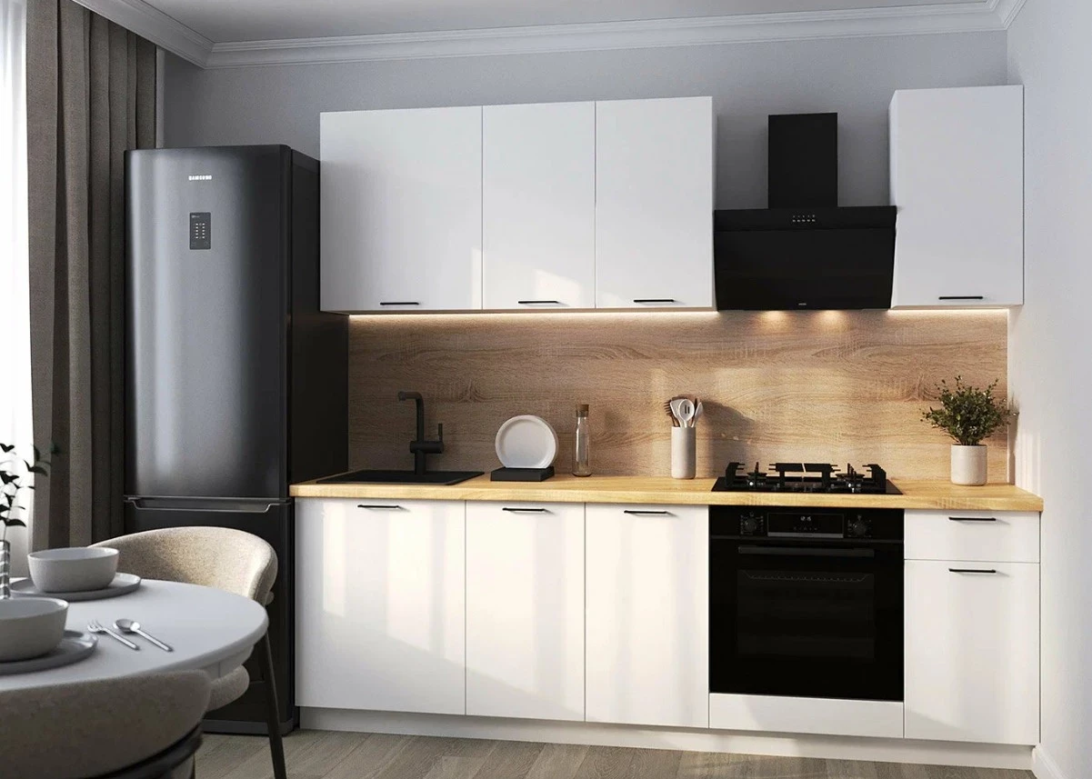 Кухонный гарнитур Hoff в белом цвете с фасадами «белый софт» — грамотное решение для тех, кто ищет баланс между стилем, функциональностью и бюджетом. Компактная длина в 240 см при разумной глубине модулей позволяет рационально использовать даже небольшое пространство. Гарнитур включает верхние и нижние шкафы, а также тумбу под духовой шкаф — идеальный набор для базовой кухни. Отличный пример того, как выбрать мебель для кухни, чтобы получить максимум за разумные деньги.