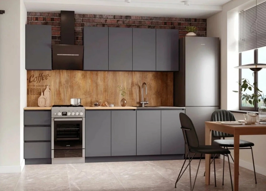 Кухня Мори — лаконичное решение для любителей минимализма и практичности. Отсутствие традиционной фурнитуры на фасадах создаёт чистый современный образ, а универсальные модули с возможностью перестановки упрощают сборку и адаптацию под любые нужды. Благодаря продуманной конструкции с межсекционными стяжками и накладной мойкой (мойка в комплект не входит) гарнитур формирует цельный и удобный рабочий комплекс. Материал ЛДСП средней плотности обеспечивает достойную долговечность при аккуратной эксплуатации. В рейтинге мебели для кухни эта модель выделяется простотой и функциональностью.