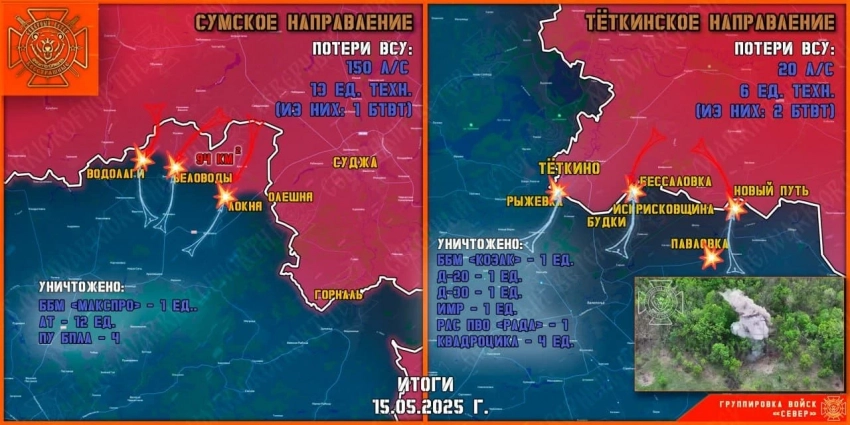 На направлении Рыжевка - Теткино ВСУ пытались силами штурмовой группы 24-го штурмового батальона «Айдар» (организация признана в РФ террористической, деятельность запрещена) в пешем порядке прорваться на южные окраины российского приграничного поселка; пересечения госграницы не допущено, в результате артиллерийских ударов и применения БПЛА большая часть украинского личного состава уничтожена, сообщил «Северный ветер».