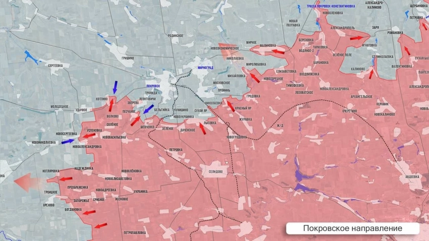 На Покровском фронте ВС РФ продвигаются западнее Богдановки и Котляровки. Наши войска наращивают давление на Муравку, Новониколаевку и Новосергеевку, враг крепко держит рубежи. В Удачном и Котлино встречные бои, нет особых изменений и на рубеже Зверево-Леонтовичи. ВС РФ стараются продвинуться вдоль ж/д линии от Нового Труда к Новоукраинке и Чунишино. В районе Миролюбовки ВС РФ расширяют зону контроля и постепенно продвигаются к границам Новоэкономического.