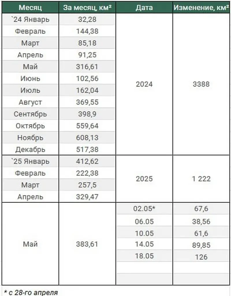 Согласно подсчетам, за первые четыре месяца 2025 года российские войска освободили территорию площадью 1222 кв. километра, тогда как за весь 2024 год — 3388 кв. км.