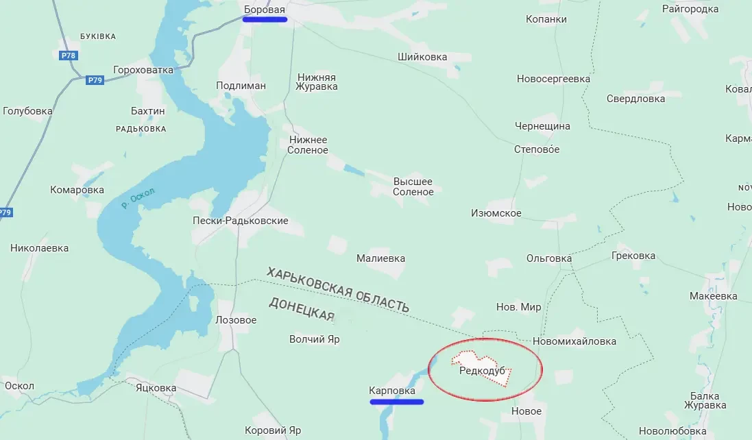 От Редкодуба до Карповки около 3 км, до Оскольского вдхр около 14 км. Также от Редкодуба около 34 км до харьковского Изюма – ключевого узла военной логистики противника на данном направлении.