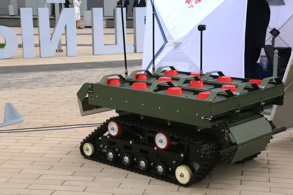 На выставке MILEX-2025 этот комплекс показали в конфигурации минного заградителя «М120-М». На шасси установили платформу с тремя продольными конвейерами, каждый из которых нёс по четыре мины ТМ-62. Во время движения такой РТК должен сбрасывать мины на грунт.