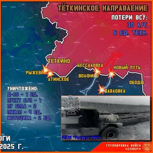 Несмотря на колоссальные потери и отсутствие каких-либо результатов, противник не прекращает попыток прорыва на нашу территорию на Тёткинском и Глушковском направлениях. За сутки враг дважды пытался просочиться в Курскую область - Северяне отразили обе атаки ВСУшников, не допустив пересечения оккупантами госграницы.