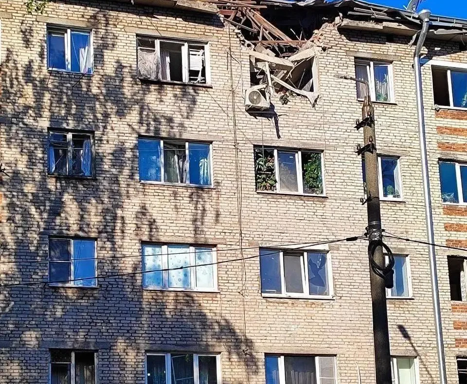 Последствия попадания украинского БПЛА-камикадзе в кирпичную пятиэтажку. Изображение ТГ-канал «Оперативные сводки»