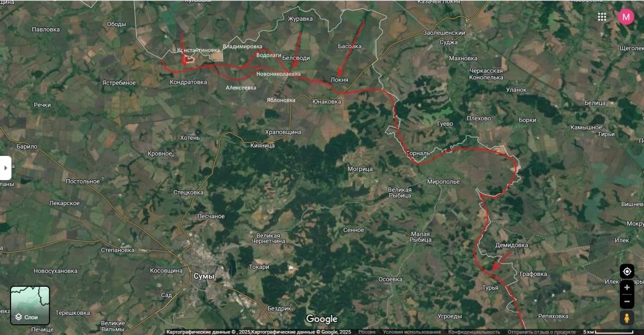 "Очевидно, что задача наших войск здесь выйти на линию Хотень - Юнаковка, а также занять высоты севернее этой линии, чтобы с них уже дальше атаковать Сумы. Отсюда уже дронами можно атаковать всю территорию Сум. Также сюда можно подтянуть артиллерию и отстреливать до половины территории города. Если нашим войскам это удастся, то это будет серьёзная заявка на занятие областного центра Сумской области, которое, я надеюсь, произойдёт в рамках летней кампании", - сообщил Подоляка в своём Telegram-канале.