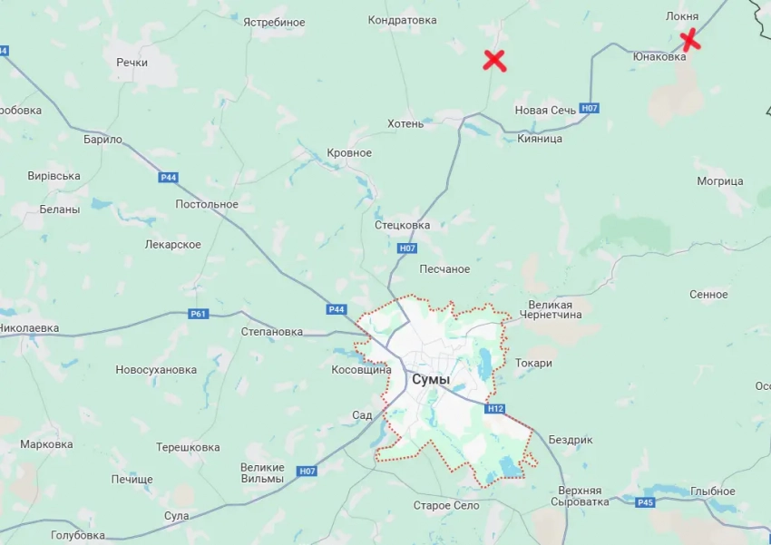 Расстояние от передовых подразделений ВС РФ до северной окраины Сум - около 18 км. При этом Сумы не только областной центр как таковой, но ещё и центр схождения основных дорог на северо-востоке Украины. Указанное расстояние на фоне продолжающегося продвижения армии России говорит о том, что уже сейчас у наших Вооружённых сил есть возможность взятия как минимум под частичный огневой контроль некоторых дорог, ведущих в Сумы. И в первую очередь это дорога Р44 Сумы-Путивль-Глухов.