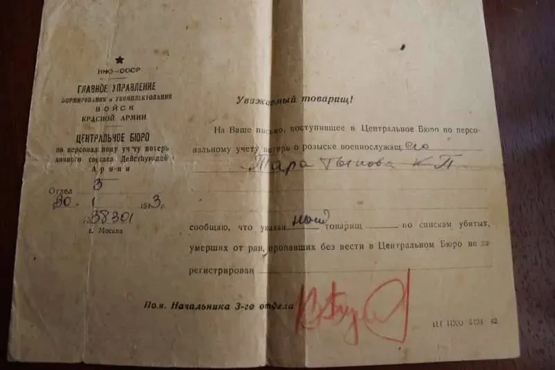 Дедушка с бабушкой тут же написали «куда надо», но им сообщили, что весь отряд к этому времени был уже уничтожен. Попытки найти пропавшего сына они предпринимали очень долго. Писали запросы в военкоматы, но ответы всегда были одни и те же: «В списках убитых и раненых не значится». Вот так жизнь молодого парня в 18 лет и оборвалась…