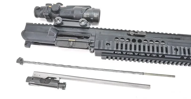 Улучшить винтовку AR-15 пытались многие конструкторы, и вот во что они вылились. Появилась промежуточная конструкция между AR-15 и АК, в которой газы из ствола отводятся не прямо в затвор, а толкают короткий подпружиненный поршень, который выходит в ствольную коробку и наносит удар по затвору. Тот отходит назад, а толкавший его стержень силой пружины возвращается на прежнее место. То есть пороховых газов в ствольную коробку попадает в разы меньше, чем при прямом газоотводе. Газовую трубку проще чистить, так как она довольно толстая и короткая.