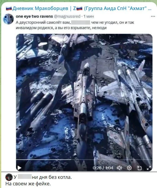 "Очередной пример - видео, разлетающееся по немецкому и англоязычным сегментам Twitter, на котором якобы показаны уничтоженные истребители МиГ-29 или МиГ-31. <…> Разумеется, это очередная нейросетевая поделка, собранная за пару минут на коленке: искажения перспективы, артефакты текстур, отсутствие нормальной физики корпусов и многое другое. Большинство пользователей, особенно в профильных кругах, это видят сразу. Но у такого контента другая цель - не убедить специалистов, а бить по поверхностному восприятию: создать ощущение, что "Россия теряет контроль" и "удары успешны",- отмечает "Военная Хроника".