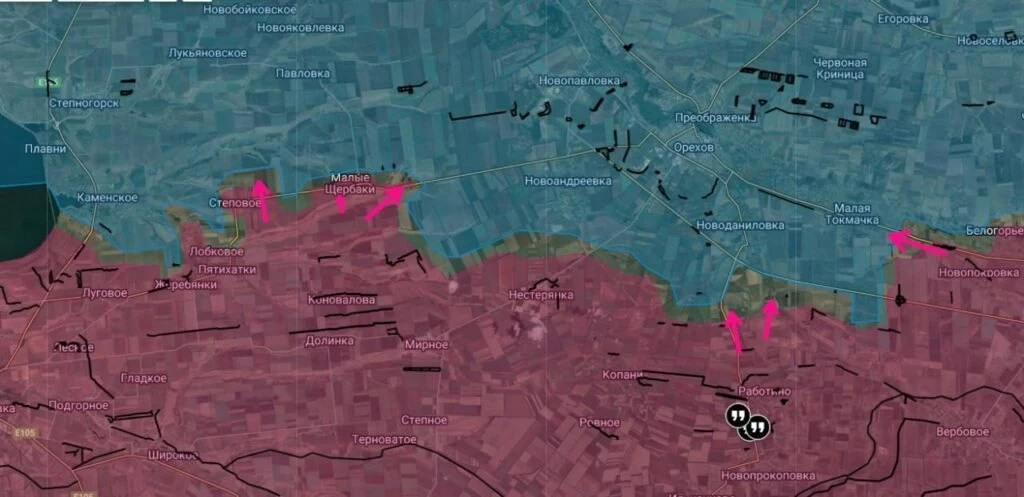 На Ореховском направлении, в районе Новоданиловки нанесено поражение бригаде теробороны ВСУ. В районе Малой Токмачки, линия боевого соприкосновения остаётся без существенных изменений. Продолжаются позиционные бои. Идут позиционные бои в районе Щербаков и Каменского. РСЗО ВС РФ наносит удары по опорным пунктам ВСУ. В небе фиксируется большое количество БПЛА.