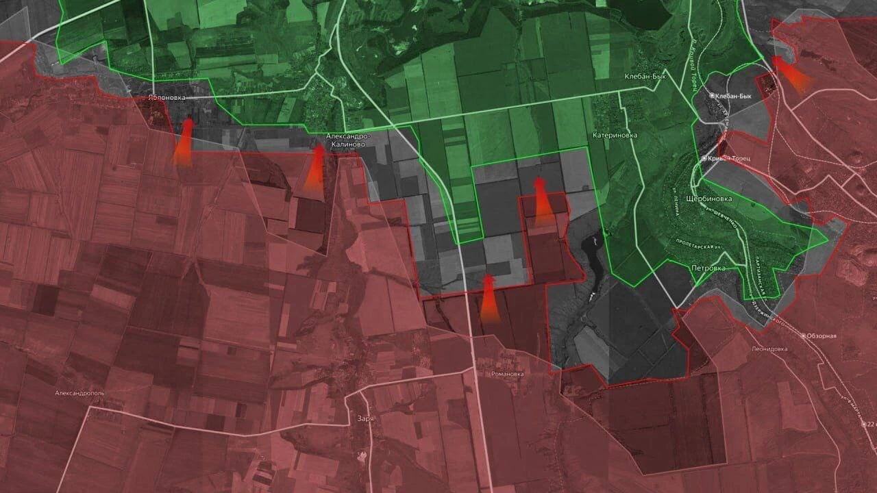 На Константиновском направлении продолжаются встречные бои в центральной части Ступочек, западнее канала «Северский Донец-Донбасс» в районе Озаряновки и в направлении Белой Горы. Западнее Торецка российские войска ведут штурмовые действия в направлении восточной окраины Клебан-Быкского водохранилища, давят в районе Нелеповки. Отмечаются интенсивные боестолкновения на южной окраине Александро-Калиново, ВС РФ расширили контроль территории южнее, севернее Яблоневки и в упомянутом населенном пункте, сообщает Telegram-канал "БелВПО".