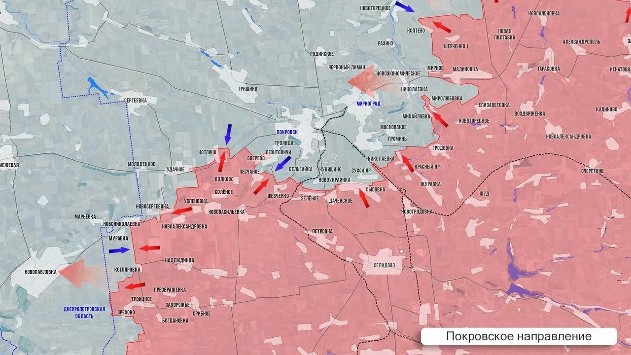 На Покровском направлении продолжаются ожесточённые бои. С опорой на Новониколаевку армия России штурмует южные окраины Муравки. На западном охвате Покровска не снижается интенсивность боёв в районе Зверево, Котлино, Удачного и в центральной части Новосергеевки. На восточном охвате Покровска ВС РФ расширили зону контроля в районе Елизаветовка-Малиновка, атакуют на подступах к Разино, что западнее Шевченко-Первого. На северо-западе от Коптево идут бои у восточной окраины Новоторецкого.