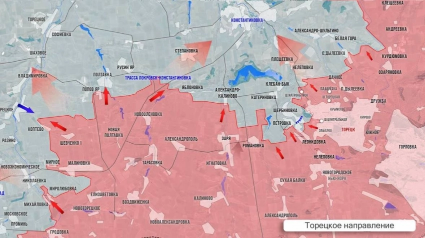 На Мирноградско-Торецком направлении армия России продвигается по рубежу Полтавка-Русин Яр, а также севернее Яблоновки, где наши вышли в район трассы на Константиновку. В самой Яблоновке бои сместились в центр. В Александро-Калиново противник стягивает резервы. В районе села Клебан-Бык бои идут уже за ж/д станцией. Контроль над этим посёлком позволит реализовать для подразделений ВСУ в Щербиновке и Петровке тот же сценарий, как и на рубеже Романовка-Заря. Там, напомню, наши подразделения отрезали гарнизон ВСУ от снабжения и окружили его между соседними сёлами.