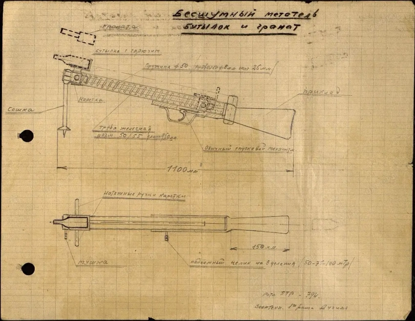 Многое из хорошего придумано до нас. В феврале 1942 года воентехник 1-го ранга 794-го полка 227-й стрелковой дивизии Дугиль Георгий Александрович предложил пружинный метатель для прицельного метания гранат и бутылок с зажигательной смесью на дальность до 100 метров. По его идее, пружинный метатель должен был дать больше шансов противотанкистам выжить при отражении танковой атаки.
