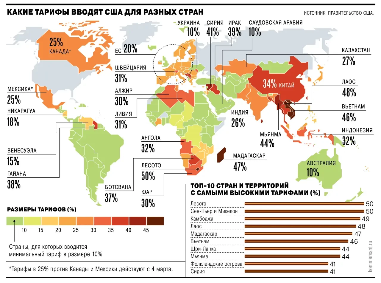 В результате эти территории получили сравнительно высокие пошлины на поставки в США. Но таких же пошлин те территории в отношении США не вводили во избежание товарных дефицитов на рынках этих территорий. А теперь – ещё большие пошлины... Высокие пошлины могут быть введены и в отношении французских заморских департаментов Гваделупа, Мартиника, Сен-Мартен, Сен-Бартелеми, французской южноамериканской Гвианы.