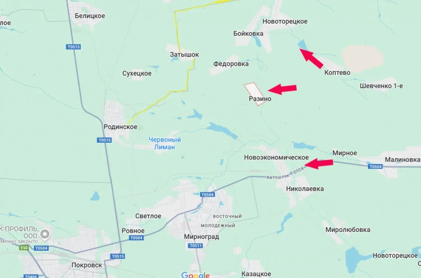Двигаясь от упомянутого Коптево, ВС РФ подошли к восточной окраине села Разино, что у берега реки Казённый Торец. Также фиксируется продвижение северо-западнее Коптево – к Новоторецкому.