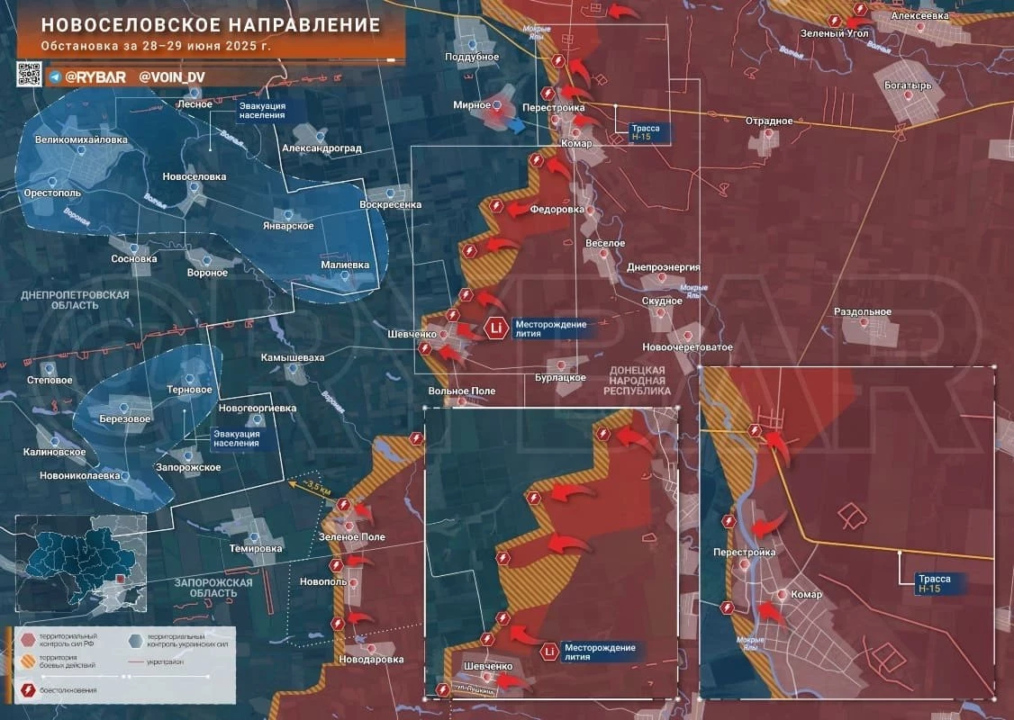 На Запорожском участке идут бои в Каменском. Наши закрепились на юге села, а ВСУ заявляют о входе наших и на севере. Контроль над Каменским, стоящим на высотах вдоль дороги Симферополь-Харьков, позволит нашей артиллерии наносить удары по Степногорску и доставать до южных окраин Запорожья. На восточном участке идёт штурм Малиновки, под контролем нашей армии большая часть ключевых строений в селе.