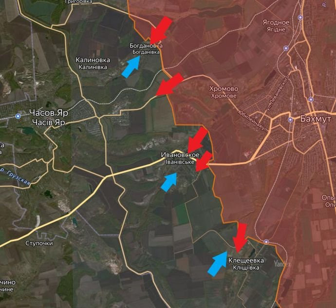 На Артёмовском направлении продолжаются штурмовые действия на северо-востоке Клещеевки. Линия боевого соприкосновения существенно не изменилась. В Ивановском (Красном) ВС РФ продолжают пробиваться через населённый пункт, тесня противника на западные окраины. Есть у российских войск небольшие успехи и в Богдановке. Там ВС РФ смогли продвинуться внутри населённого пункта, пишет Telegram-канал Wargonzo.