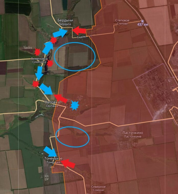 На Донецком направлении продолжаются боевые столкновения в населённом пункте Бердычи. Одновременно с этим российская армия штурмует вражеские позиции в Тоненьком, Новомихайловке и Первомайском, отмечает военкор Евгений Лисицын в своём Telegram-канале. Также ВС РФ продвигаются в Орловке, оттесняя Вооружённые силы Украины (ВСУ).