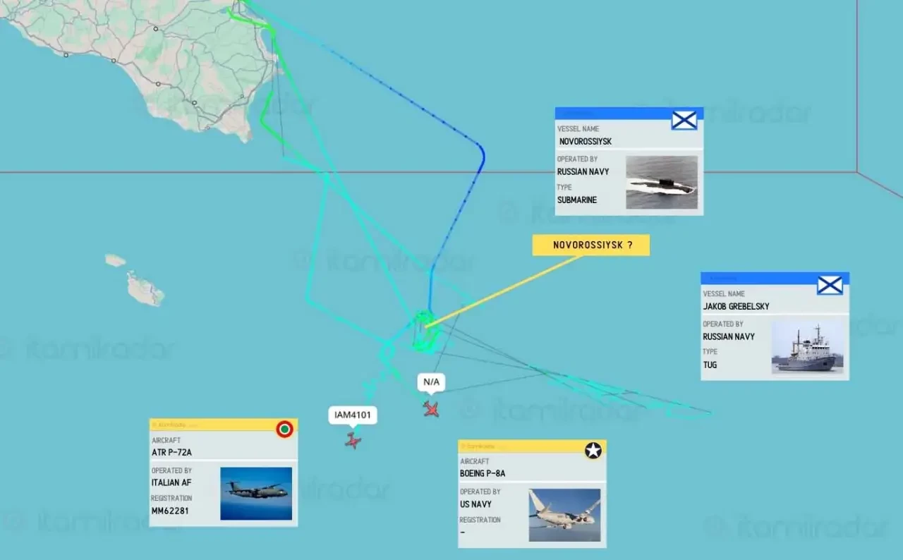 Они выполняли мониторинговые полёты на высотах от 1,2 до 3 км. Итальянский самолёт сначала пролетел несколько восточнее, над районом, где, предположительно, находится российский буксир «Яков Гребельский». Затем он немного сместился к западу, выполнив ряд коротких витков. Это изменение может указывать на то, что «Новороссийск» — подводная лодка класса «Кило», следовавшая вместе с буксиром с момента его выхода из Санкт-Петербурга, — немного отстаёт.