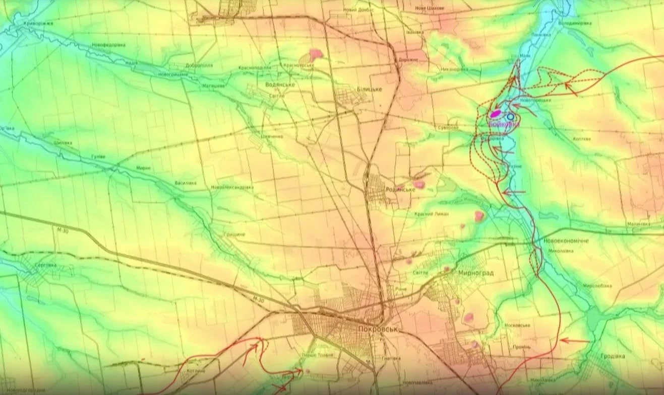 Работа по взятию второго террикона, расположенного северо-восточнее, продолжается. Немного восточнее, в районе Бельгийки, наши части предпринимают попытки выдавить противника из депо, чтобы зайти на южные окраины Покровска.