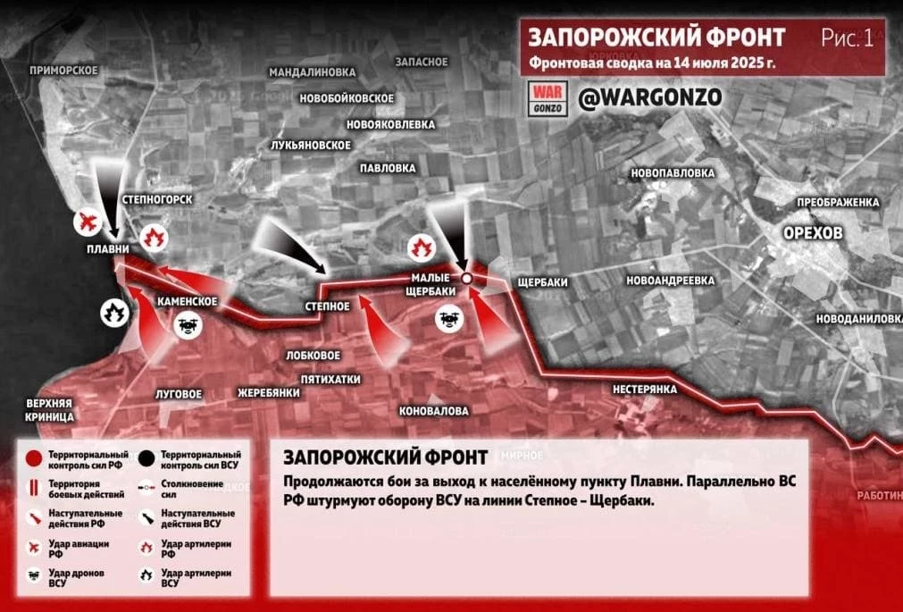 На Запорожском направлении продолжаются бои за выход к населённому пункту Плавни. Параллельно ВС РФ штурмуют оборону ВСУ на линии Степное - Щербаки.